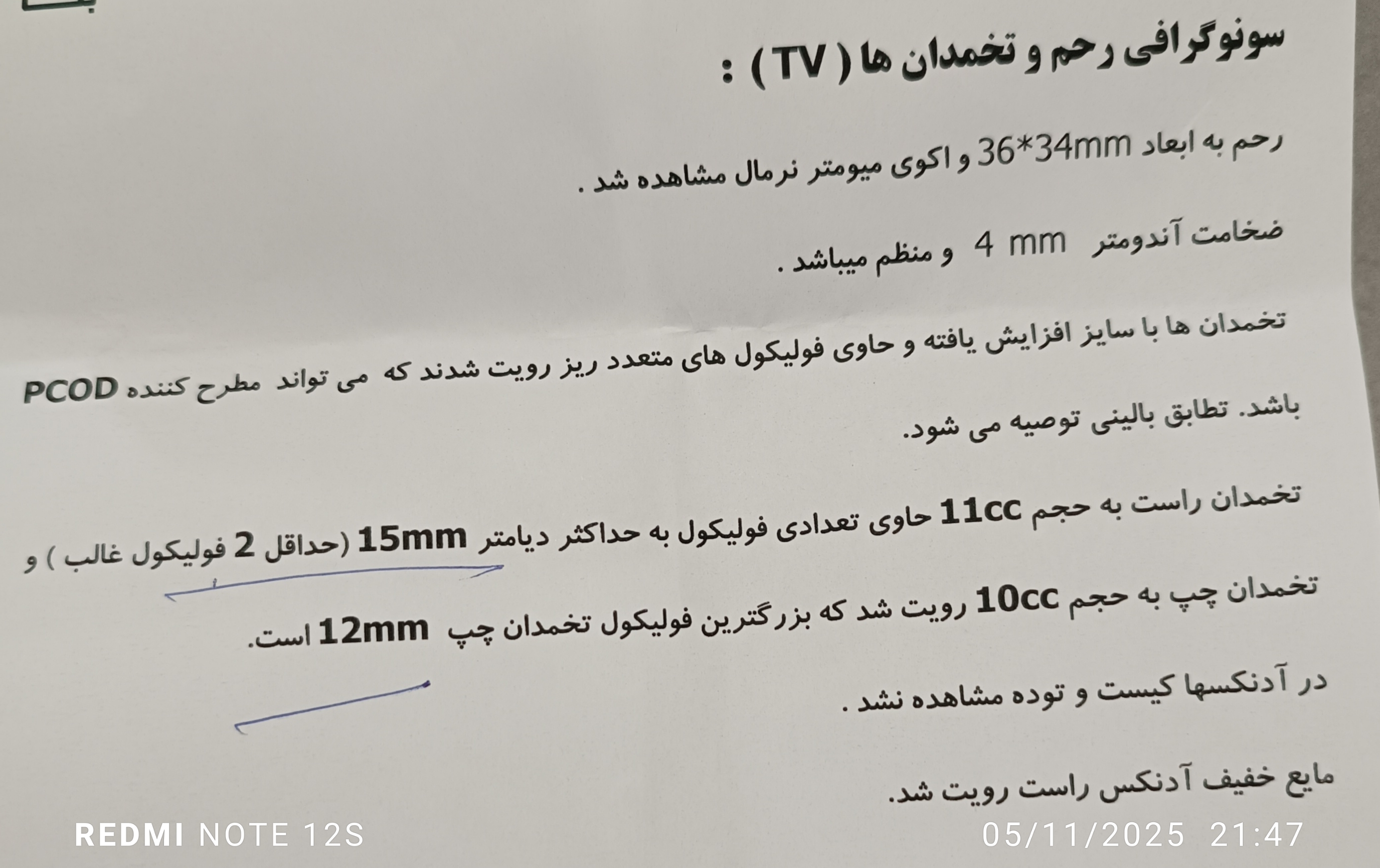 سلام خوبی من 28سالمه و10ساله نازایی دارم شوهرم یکم ضعیف بود که دارو مصرف کرد خوب شده من تنبلی تخمدان دارم وبرای بارداری اقدام کردم این ماه لتروزول وکوالی فول اوزیل پلاس ویتامین D.E.Cمصرف کردم تخمدان سمت راست نوشته حداقل 2 فولیکول غالب 15میل مایع ازاد هم داره سمت چپم ی فولیکول 12میل سونو روز یازدهم ضخامت آندومتر 4بود من ضخامتم ماه های قبل 7بود ولی این ماه لتروزول خوردم تا روز دهم لکه بینی داشتم الان دکترم برای روز 14بهم آمپول آزاد سازی و دوفامد داده به نظر شما این ماه شانس باروری دارم با این ضخامت کم