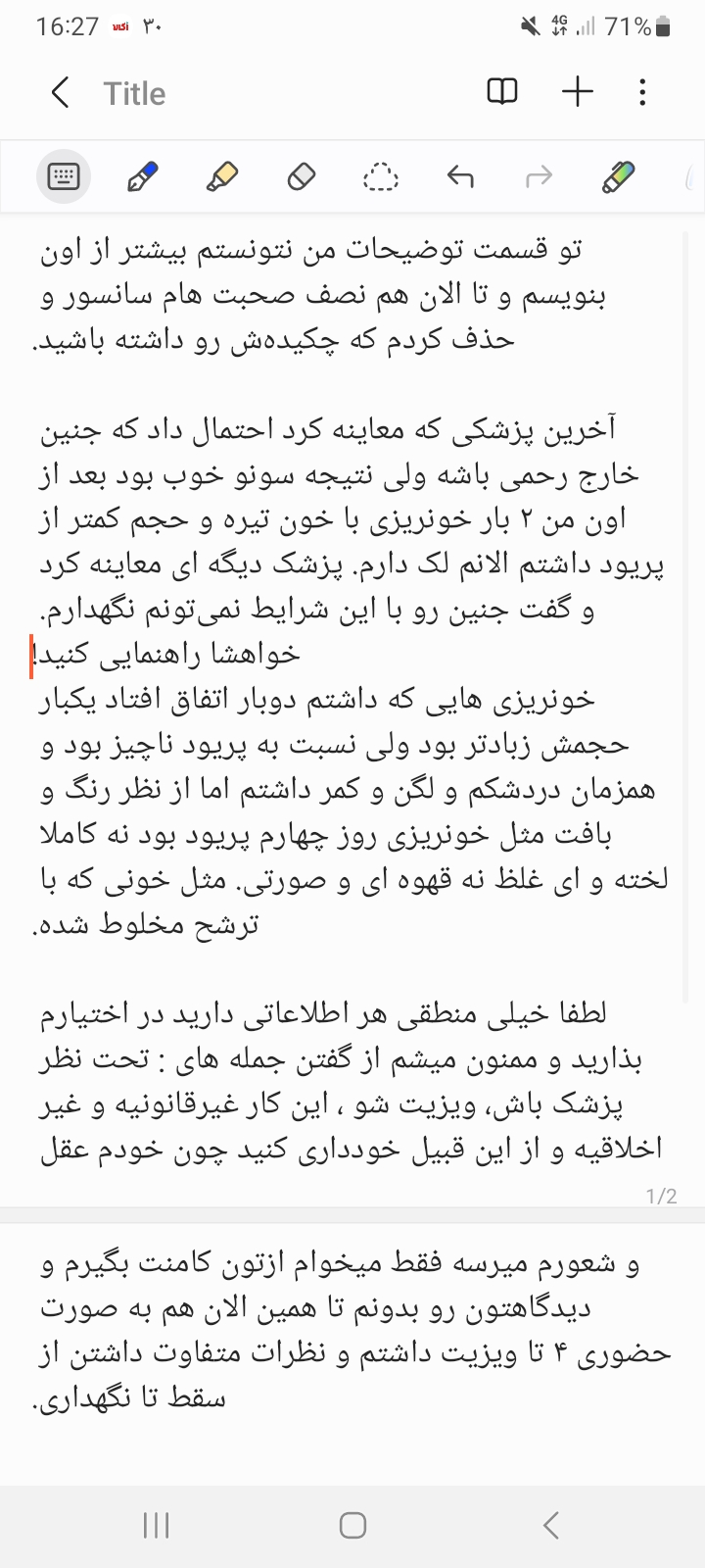 سلام وقت بخیر من در هفته ۶ و روز ۱ بارداری هستم. قبل از بارداری، پرولاکتین بالا داشتم (۲۴.۸) پریودهام منظم بود تا اینکه درد شکم و کمر داشتم تو روزهای آخر یکی از پریودای اخیرم که با سونو متوجه شدم میوم ۱۶mm در رحم دارم. دو سه دوره پریودم بینظم شد. تا اینکه این سری کاملا ناخواسته باردار شدم، (با قرص اورژانسی که ۶ ساعت بعد سکس مصرف کردم) قبل از بتا علائم پریود داشتم بعلاوه احساس بازشدن دهانه رحم داشتم و بعد علائم فیزیکیم تا چند روز از بین رفت اما درد شکمی و خلق و خویی همچنان بهم ریخته بودم. حدودا ۷ روز تاخیر داشتم که یهو لکه و درد اومد سراغم شبیه پریود بود ولی دوباره قطع شد و یکی دو روز لک قهوه ای به مدت یکی دوبار اومد ولی نشدم بعدش از بی بی چک و بتا متوجه شدم باردارم بعد از اون گاهی لکه هایی رو میدیدم مقدارش کم بود و صورتی یا قهوه ای بود.